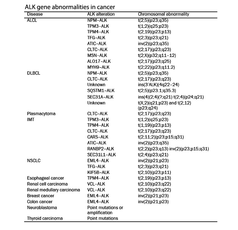 クローニングされたalk遺伝子は正常組織では脳と末梢神経系の一部のみに発現している。ヒトでこれ以外の組織にalkが発現するのは異常であるといえる。
