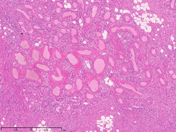 - 血管は特徴的な構成成分でとても厚く異常な壁をもつ。多くの領域で血管の筋組織は厚い線維結合組織で置換され厚みは不規則となりArteriovenous malformationに認められる動脈化静脈に類似する。内弾性板は通常欠損しているか存在しても断片化, 複層化しボロボロである。