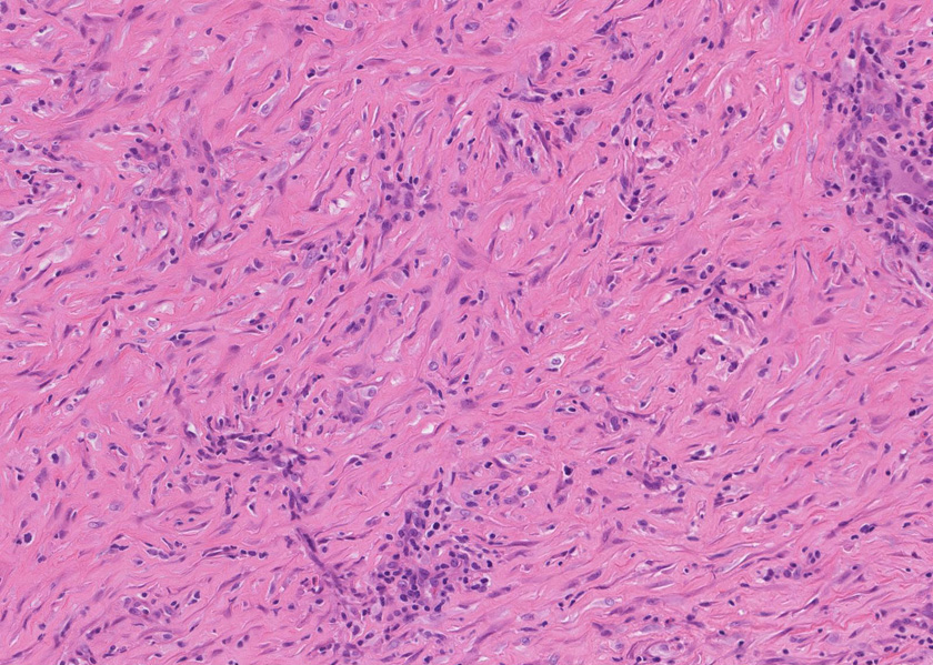 線維化組織に類円, 葉巻型淡明な核の紡錘型細胞が増生している。免染SMA陽性。血管周囲に慢性炎症あり。
