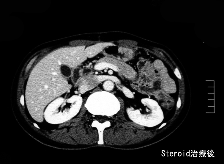 悪性リンパ腫や膵癌など悪性腫瘍は否定され自己免疫性膵炎と診断し, steroid治療を開始する。約2ヶ月の投与で, 膵、腹腔腫瘤は著明に縮小または消失しました。steroid減量中に黄疸が出現, 画像診断で硬化性胆管炎の合併をうたがいsteroidを増量、黄疸は消失。以後steroid をゆるやかに漸減し中止したが症状の再発はない。