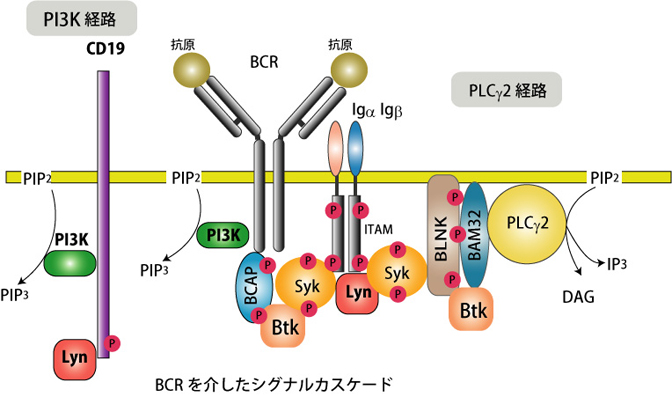 - これによりSykのITAMリン酸化部位への動員と活性化が誘導され、さらにBtk(TEC-family PTK)が活性化される。