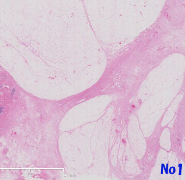 後腹膜多結節性病変は, ほとんどが成熟したように見えるfat cellから構成されている。細胞は種々のサイズ,形態を示し,小葉構造をとるmono-あるいはmultivacuolated lipoblastが散在する。線維血管性の隔壁は厚かったり薄かったりするが, その中には異型のある紡錐形あるいは多形を示す間質細胞が認められる。well differentiated lipoma様のliposarcomaの所見を呈しています。(Virtual Slide-No.1 and No.2)