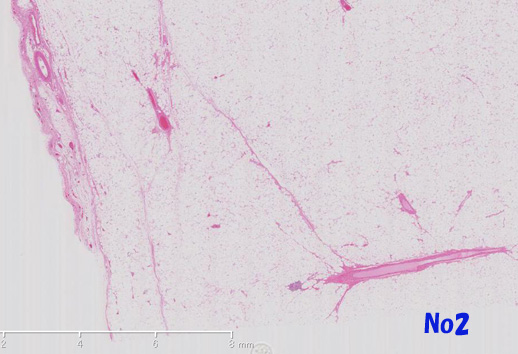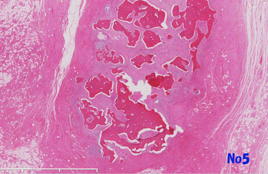 他の部分では異型細胞は, リンパ濾胞がよく発達した豊かな膠原線維性またはfibromyxoidな間質を伴って増殖しておりsclerosing and/or inflammaory variants of well differentiated liposarcomaの所見を呈する(Virtual Slide-No.3 and No.4) 。metaplastic ossificationが一部に認められた(Virtual Slide-No.5) 。
