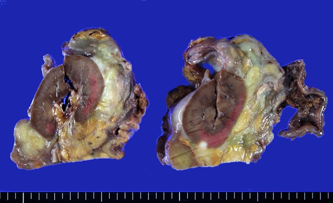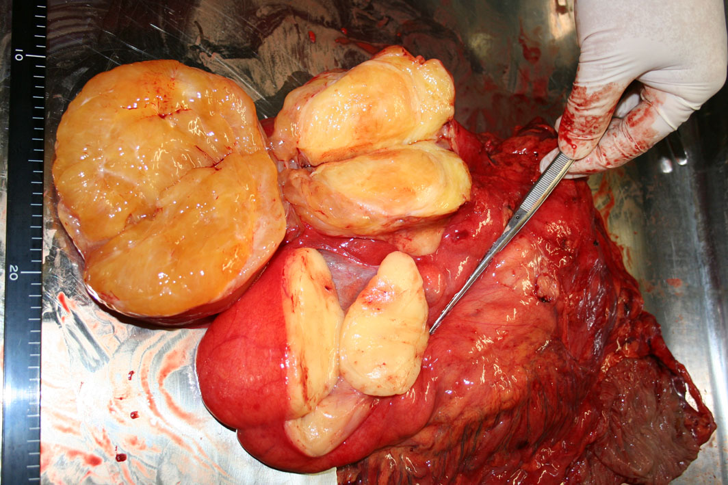 固定前の肉眼所見。後腹膜に3個の大きな結節状腫瘤が認められる。左図ピンセットでつまんだ近傍に右腎が存在する。右割面。