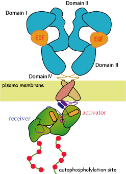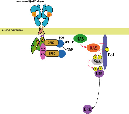 EGFRに結合したGRB2とSOS複合体はRasの近傍にSOSを配置することになり, RasのGTP付加とRasエフェクターである, Rafキナーゼ, PI3K(phosphatidyl inositol 3-kinase)の活性化が続いておこる。