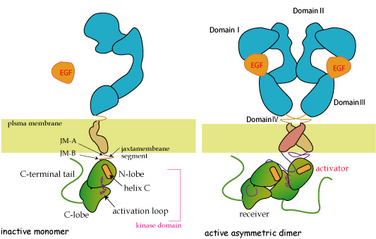 GRB2はRASへのEGFRシグナルに必須であり, そのSH2 (Src Homology-2)ドメインが直接、活性型EGFRの1068と1086リン酸化チロシンへ結合するかチロシン-リン酸化アダプター蛋白SHCを介して間接的に結合する。