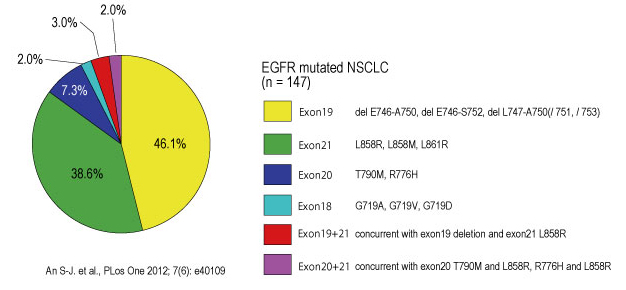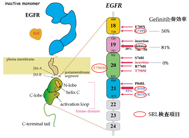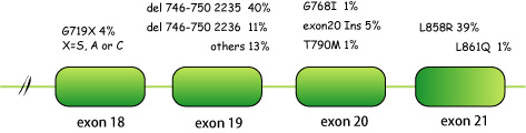 gefinitibの腫瘍縮小効果はEGFR遺伝子の体細胞変異の有無と強く相関することが2つのグループから報告されている。*4*5