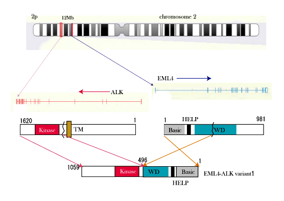 EML4遺伝子とALK遺伝子はヒト第2染色体短腕(2p)上において12Mbpしか離れていない部位に互いに反対向きに存在する。各遺伝子上でゲノム切断がおこり、ついで非常に小さな逆位 inv(2)(p21p23)を形成することでEML4-ALK融合が形成されるようである。(通常のGバンド法では検出困難). この融合遺伝子はEML4のcoiled-coil構造により恒常的に2量体化し、常時活性化されたチロシンキナーゼ活性により発がんを誘導することが確認されている。*5