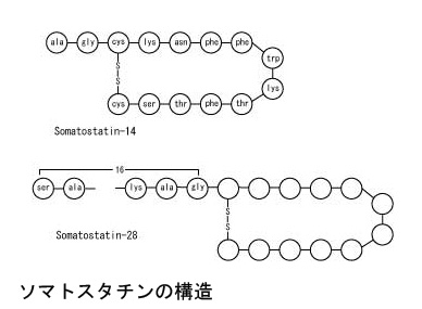1973年Brazeauらによりヒツジ視床下部抽出液中に存在する成長ホルモン分泌抑制因子として発見されたペプチドホルモン。ソマトスタチンには 3, 14位のシスチン残基間S-S結合による環状構造をもつソマトスタチン14とソマトスタチン14のN末端にArg-lysの塩基ペプチドを介して14個のアミノ酸が連結したソマトスタチン28の2種類がある。*3(図)