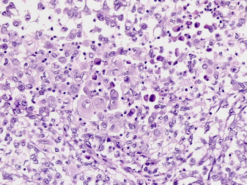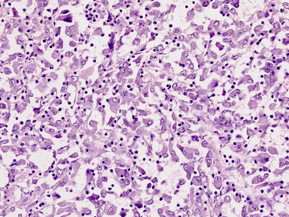 組織学的所見には幅があり、時々ラブドイド細胞を含むが, おとなしい形態の上皮様細胞がシート状または中心に壊死を伴った結節状に増殖する所見もあれば, 紡錘形の細胞増殖を示すものもある。