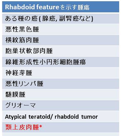ラブドイド細胞の出現する腫瘍(右図:類上皮肉腫は除く。)においてINI1が陰性にならないことが確認されている*3