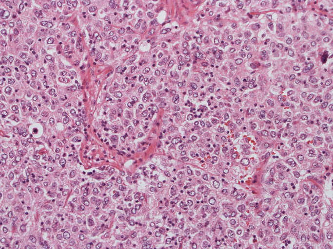 - 個々の腫瘍細胞は卵円形核を有し, 核膜は薄く, クロマチンは核縁により核小体は不鮮明あるいは相対的に小型である。多核(分葉核)や核内偽封入体を認めることもある。核分裂の頻度は低い。