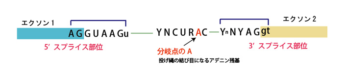 - 核イントロンには3', 5'末端にあるスプライス部位のコンセンサス配列のみでなく, 分岐点共通配列が存在している。その配列は酵母ではほぼ一定のUACUAACである。高等真核生物では、この配列はもっと多様性があり, YNCURACである。すべての場合において, 分岐点にあるヌクレオチドは共通配列の最後のAになる。