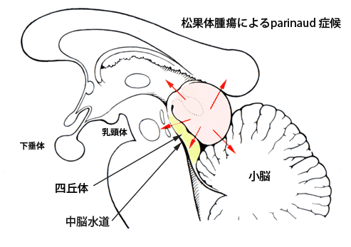 1.上方注視麻痺---上丘核を含んだ中脳蓋への圧迫でおこる。