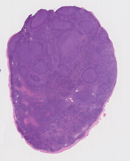 大きな胚中心を持つ多数のリンパ濾胞が見られる。胚中心の辺縁は不明瞭でマントル層も薄くなっている。1カ所マントル層リンパ球の侵入によりバラバラになった巨大な胚中心が認められ, macrofollicular patternと記載されるPTGCです。
