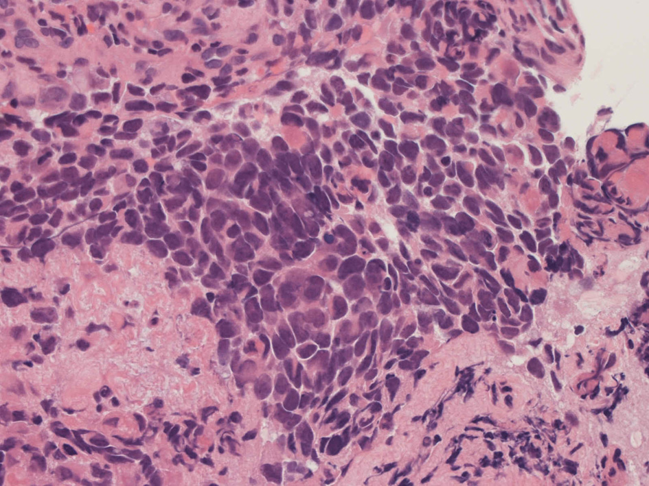 右頸部のしこりを自覚。近医MRIで頸部多発リンパ節腫大あり当院を紹介される。右顎下, 右鎖骨上窩にも多数のリンパ節を触れる。穿刺細胞診ではcarcinoma疑い。右鼻腔, 上顎洞にも腫瘤が認められリンパ節腫大との関係を調べるために鼻腔腫瘤の生検が行われる。
