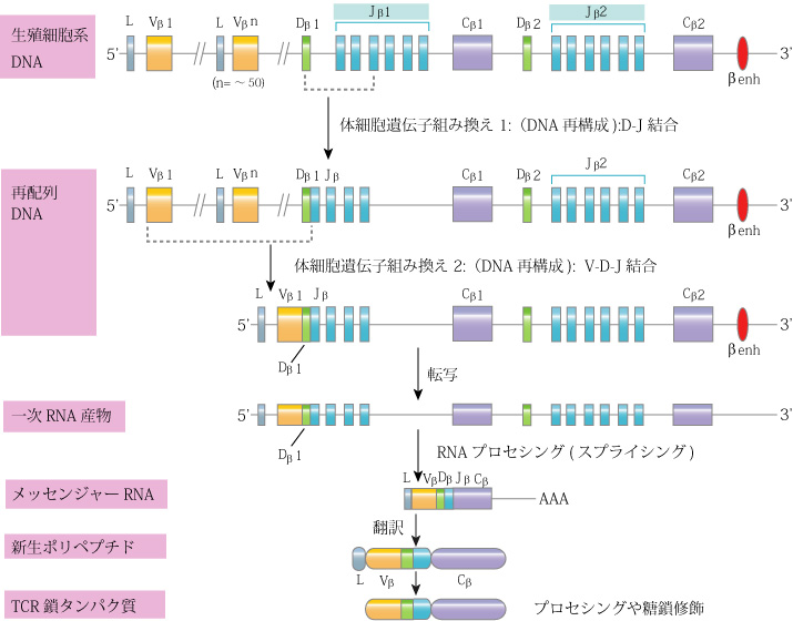 機能的T細胞抗原レセプター遺伝子は体細胞遺伝子組み換え[somatic recombination(rearrangement)]という過程により胸腺中の未熟T細胞において生成される。