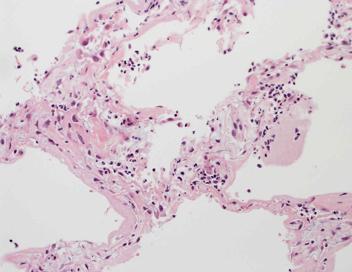 肺胞壁に多数の好中球浸潤。肺胞腔内に出血。 capillaritisが起こるWegener' granulomatosis劇症型には, なかなか肉芽腫性病変を見つけることは難しい
