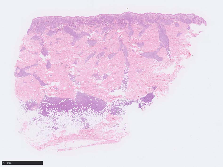 腫瘍細胞は真皮を主座として, 皮下脂肪織まで, びまん性かつ単調monotonousに増殖することが多く, 表皮向性はみられない.