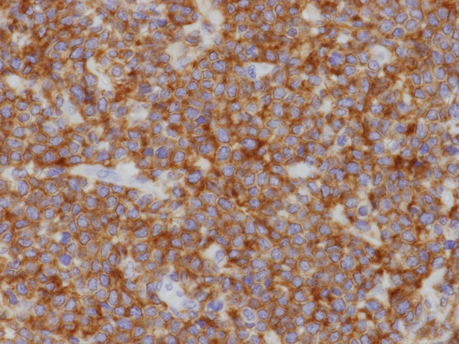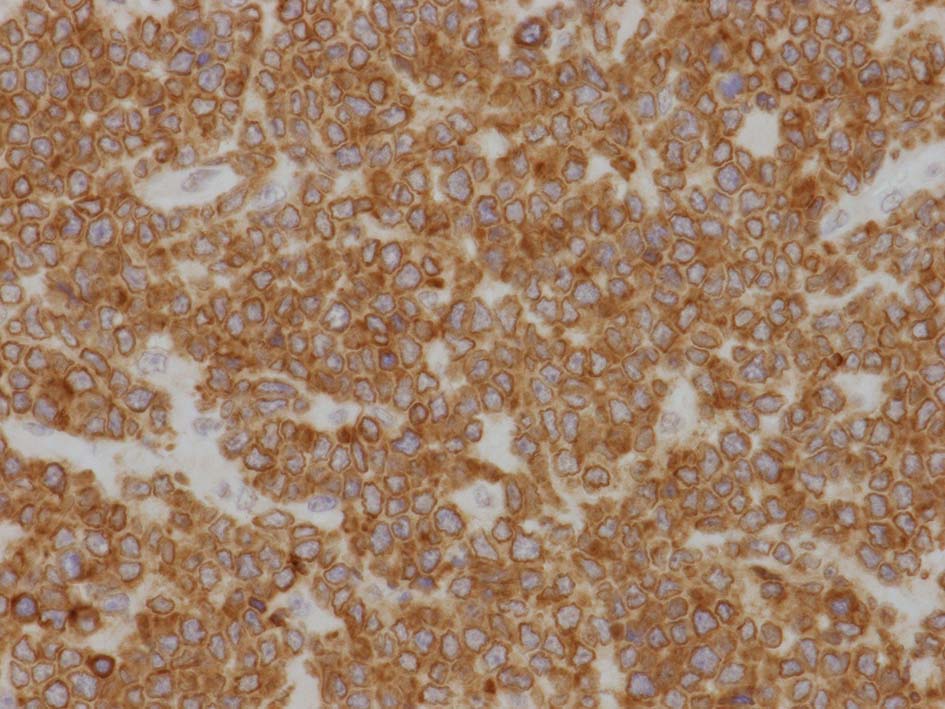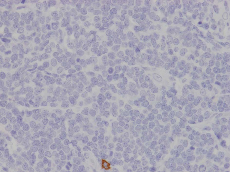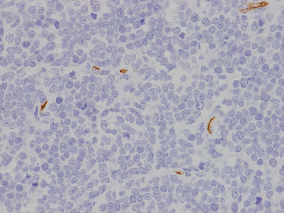 左肘窩リンパ節の病理診断は T-lymphoblastic lymphoma(T-LBL)になる. 1年後の再発で, 精巣リンパ腫と異なったものが発症するとは考えにくく, 精巣病変にTdT, CD99, CD34, CD117を追加染色した.