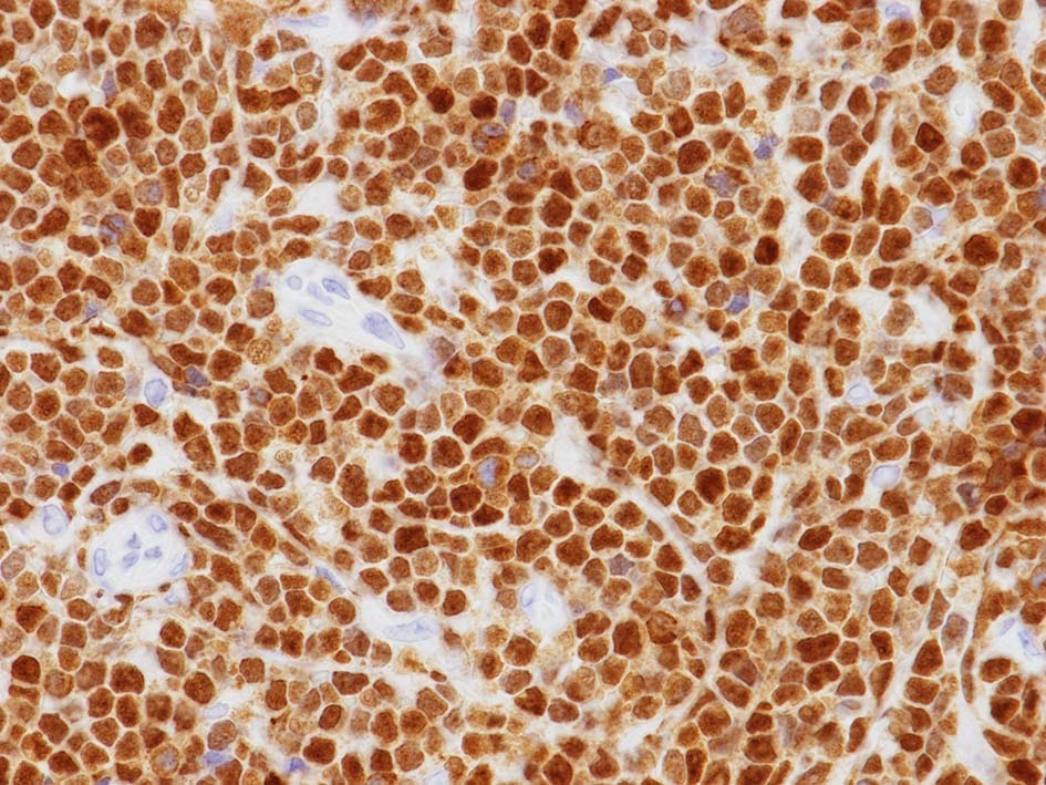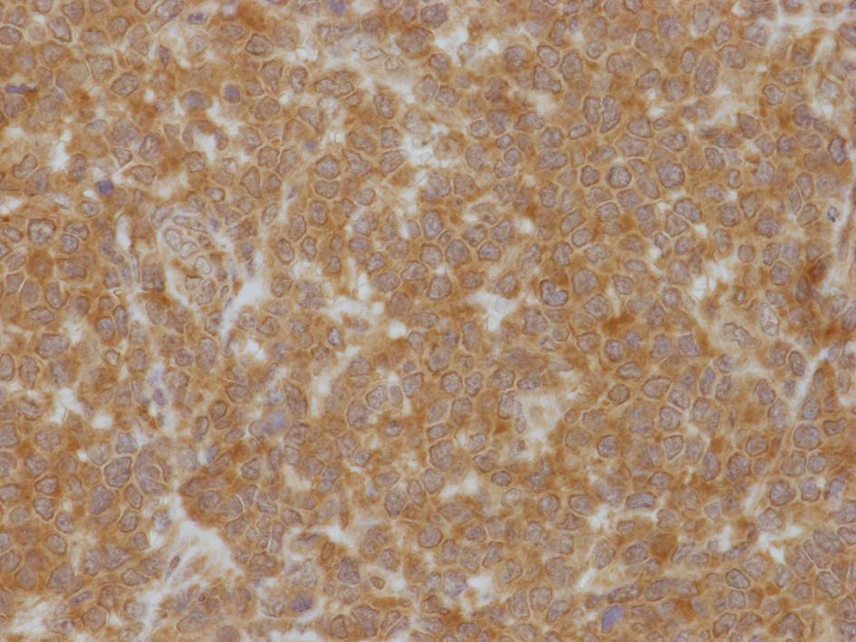 左肘窩リンパ節は正常構造を消失. 類円形の繊細なクロマチンをもつ,核小体の明瞭な核をもつN/C比大の細胞が密に増殖している. 精巣の成熟したリンパ球とは核所見が異なる(白膜増殖部には類似の細胞が認められていた).