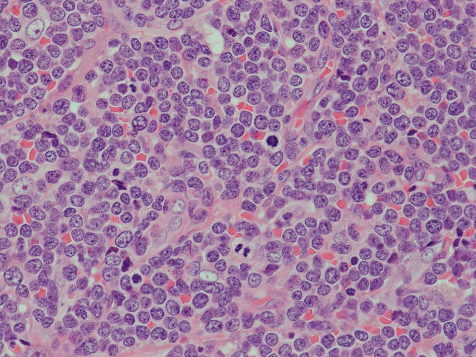 loupe像Aの領域: 精細管をスペアするように, 小型リンパ球優位, 一部中型のlymphoid cellsがシート状密に浸潤増殖する. tubulesのほとんどにはlymphoid cellsが浸潤していないが, LELに似たようなlympho-tubular lesionが少数認められた. x400高倍率では, 増殖細胞は, 粗く, 凝集したクロマチンをもつ類円形, non-cleavedな核をもつ細胞質の乏しいlymphoid cellsである. 核小体か凝集したクロマチンかわかりにくい.