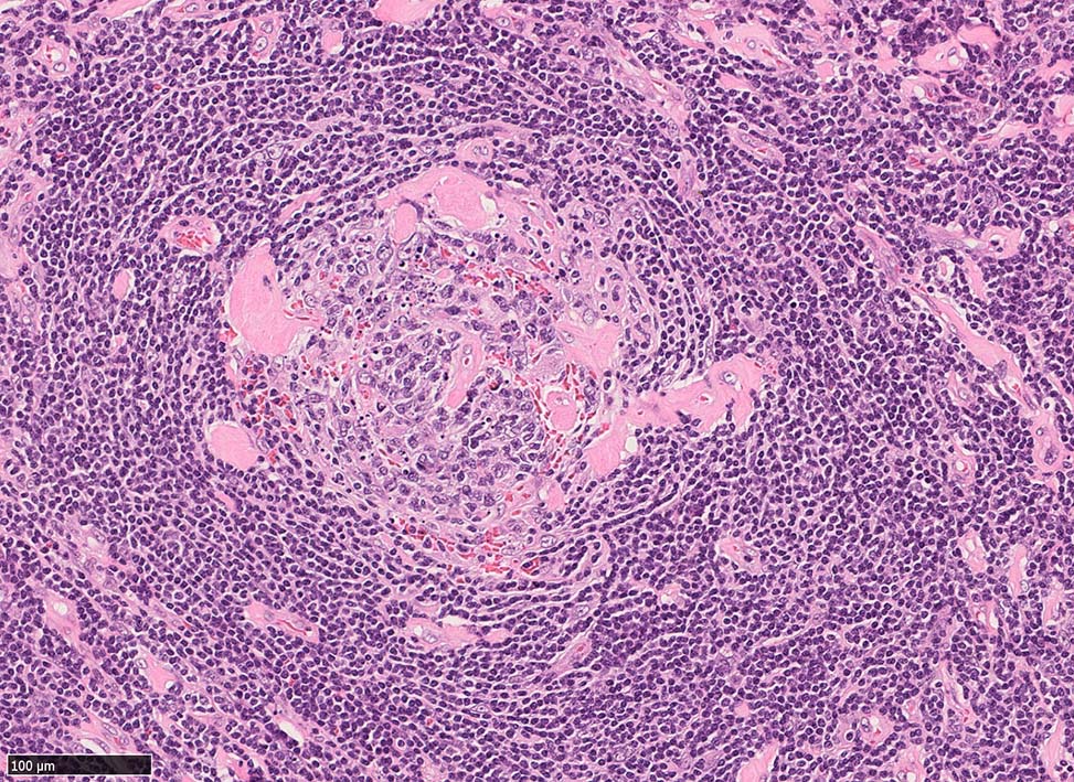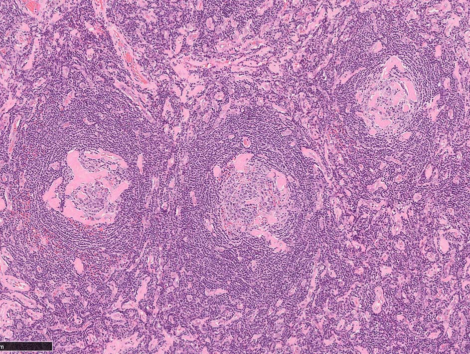 この2種類の組織型は症例ごとにさまざまな割合で混在している。全例に共通なのはたくさんのリンパ濾胞が出現していること。