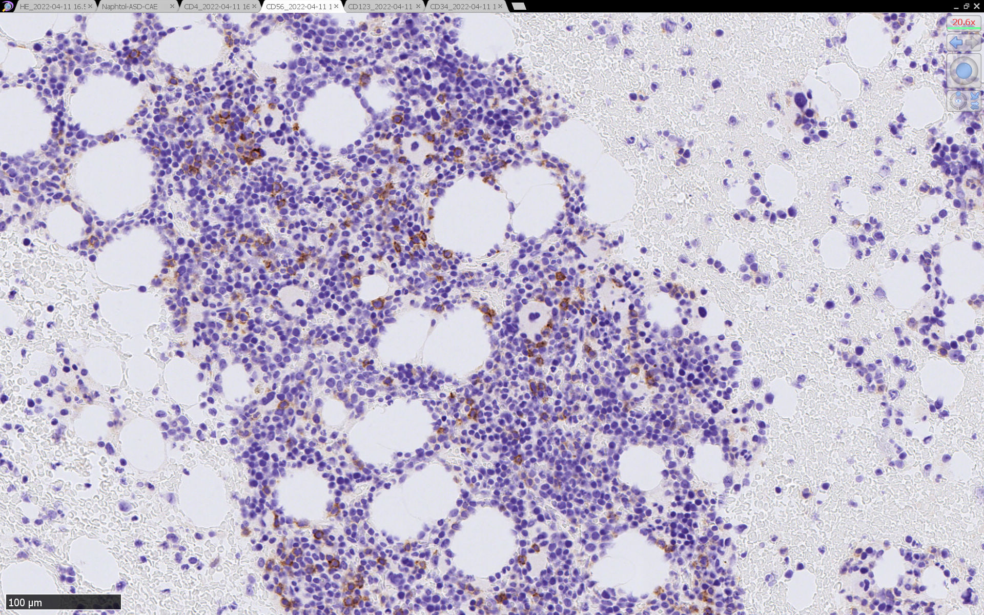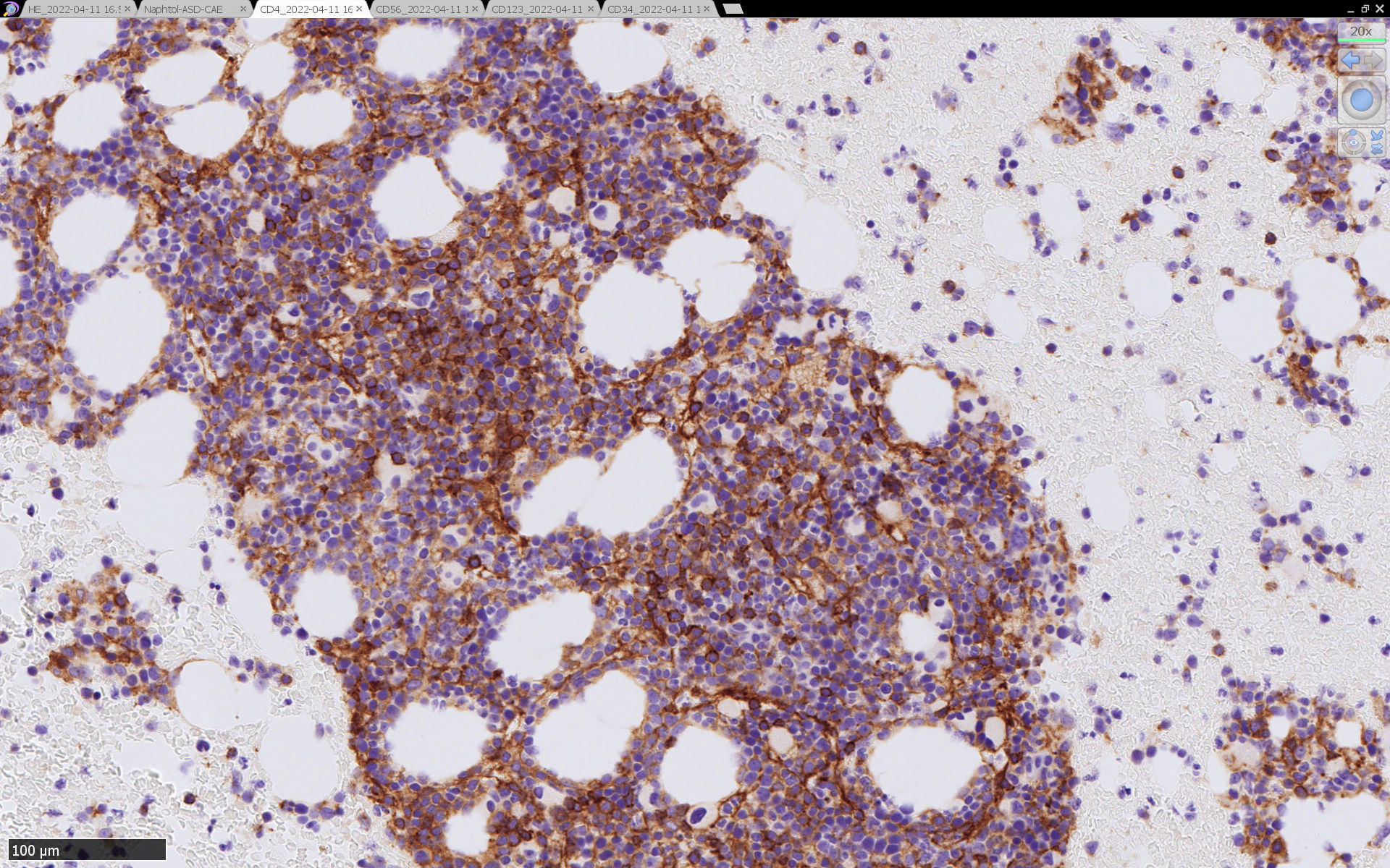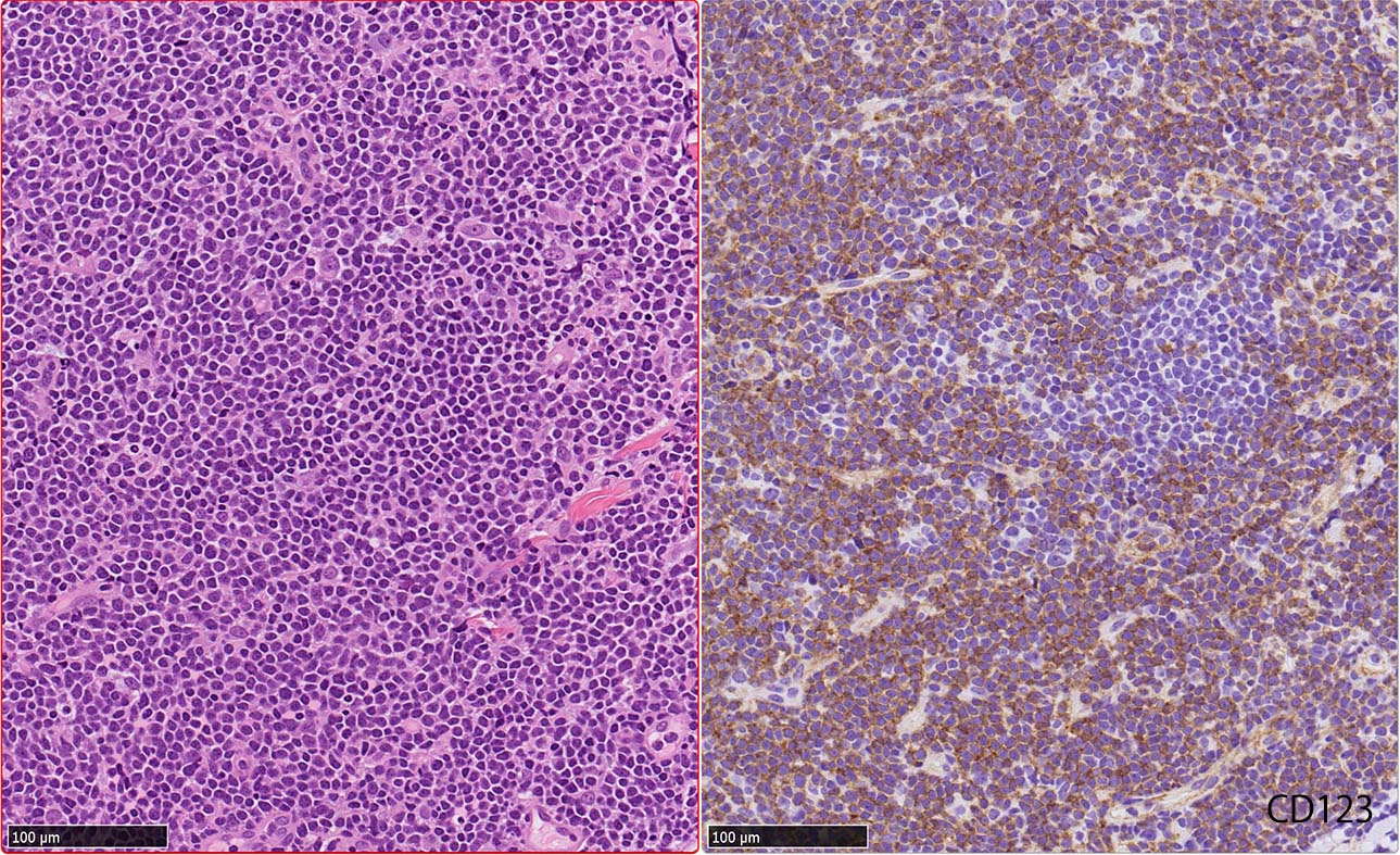 CD4は染まりすぎの感がある(濃く染まる細胞はCD4+ T-cellかもしれない). CD56, CD123が陽性で可能性が高くなり, BPDCNの診断にはCD34は陰性であることが必要。