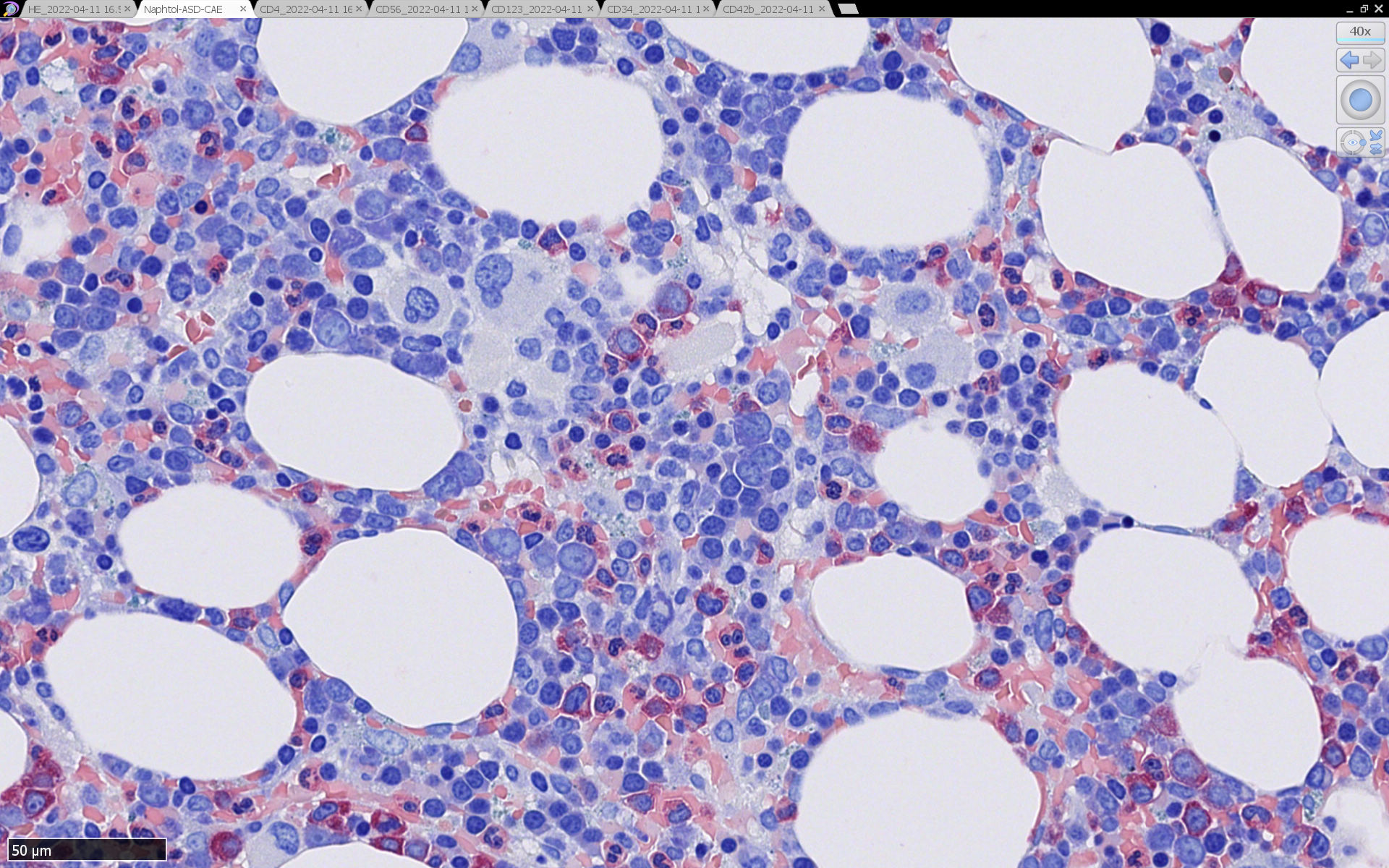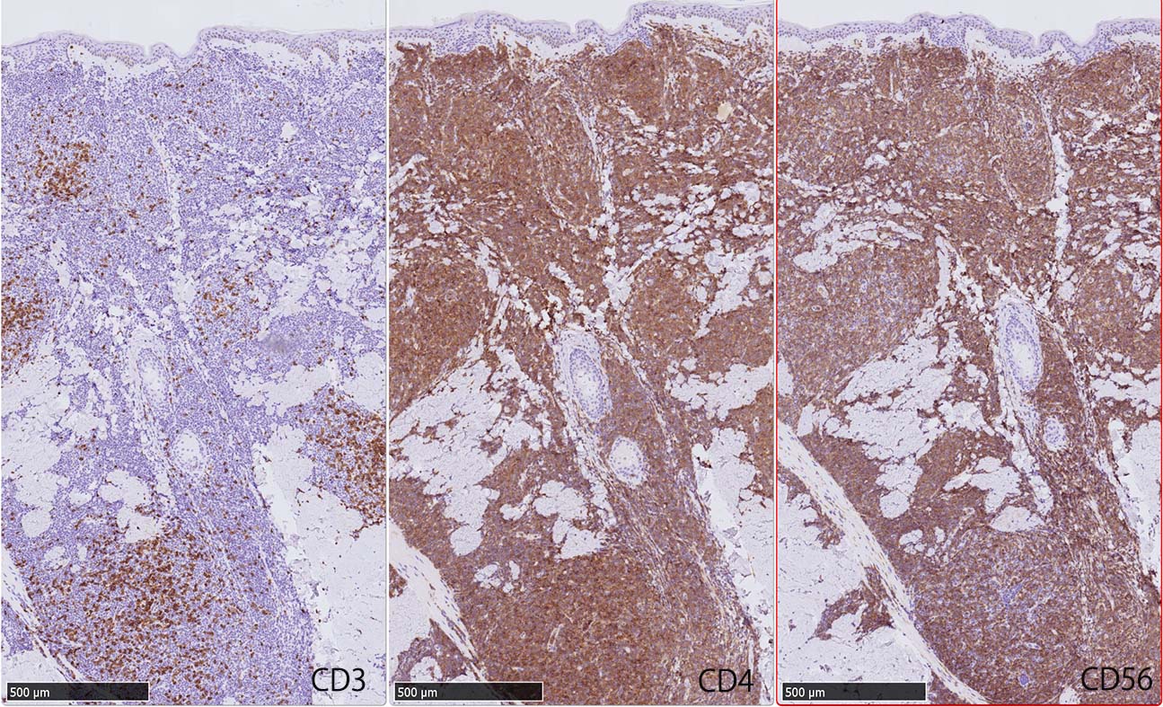 HEでは腫瘍細胞の同定が難しい. 本症例は ASD-Giemsa染色を見ても, 腫瘍胞巣はよくわからなかった. 皮膚が先に診断がつき, 次いでBone marrowだったため, 免疫染色にすすめたが, Bone marrowが先だと診断に困ったかもしれない.