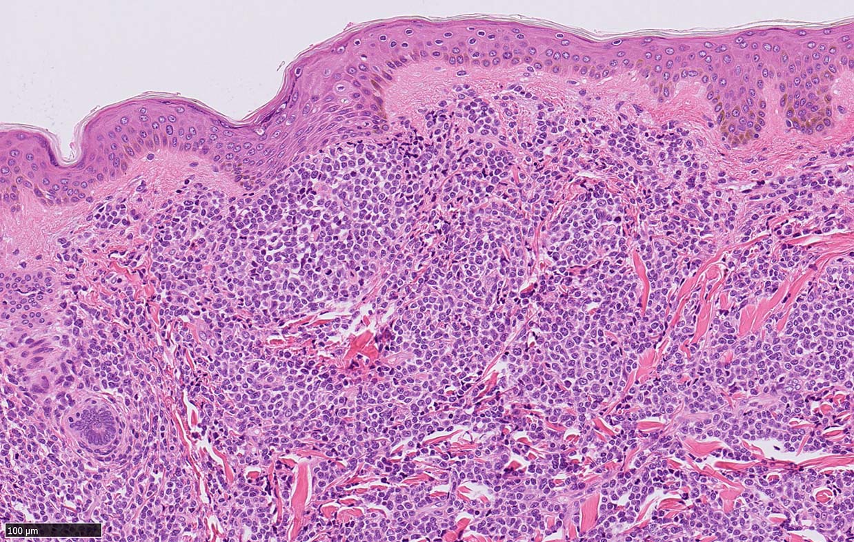 腫瘍細胞は真皮を主座として, 皮下脂肪織まで, びまん性かつ単調monotonousに増殖することが多く, 表皮向性はみられない. 本例では血管や付属器中心あるいは脂肪織内に結節状の浸潤増殖を示した.