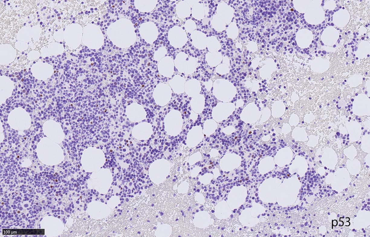 免疫染色では, HbFを発現する赤芽球の集簇巣が散見しているほか, p53陽性細胞が軽度に増加している. CD34陽性細胞増加はなし.CD42b染色でmicroMgkはみられなかった. 異形成造血が強く疑われる.