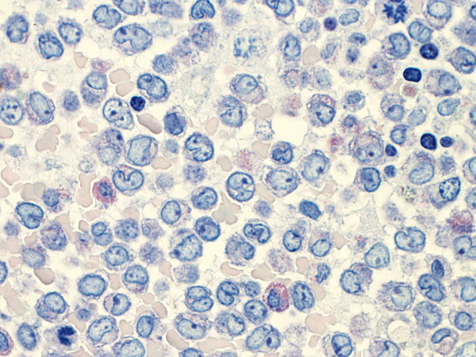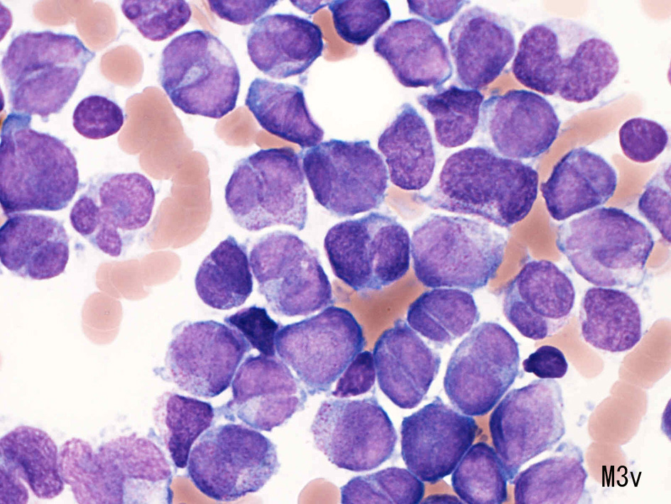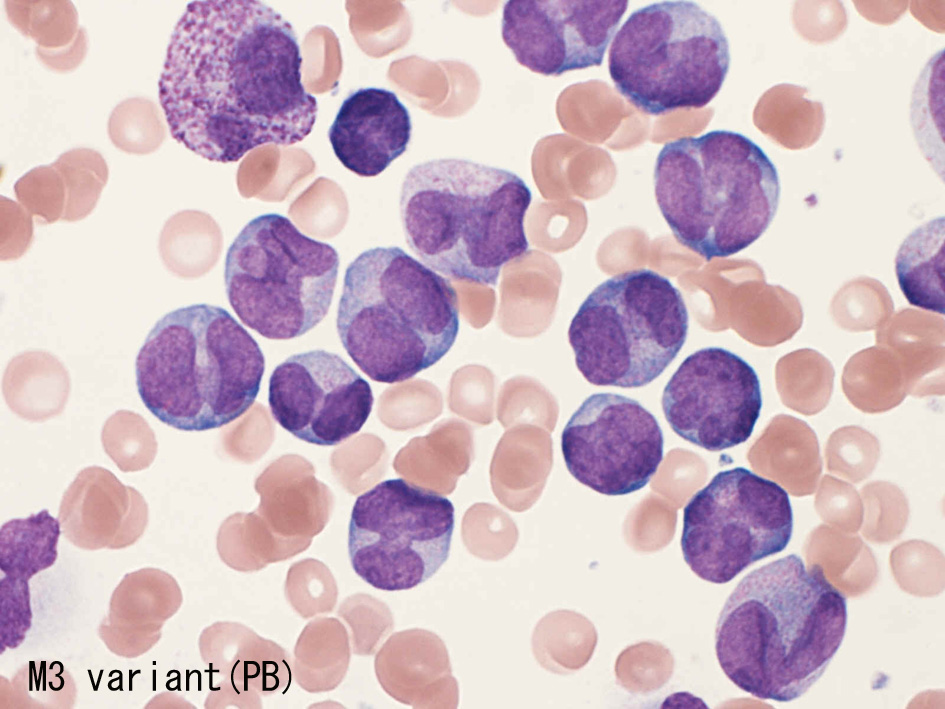 末梢血はleukocytosisを示し, 異常なpromyelocyteの増殖が著明。核はダンベル状, クローバ状, 奇妙な形にねじれている。アズール顆粒は認められるが全体に少ない。myeloblastの増加も見られる。骨髄smearでも異常promyelocyteの著増あり。Aurer bodyが認められる他, fagott cellも出現している(下図;矢印)。骨髄クロット(May-Giemsa染色);切れ込みの強い核をもつ細胞質が顆粒状の異型幼若細胞が密に増殖し, 正常造血は強く抑制されている。