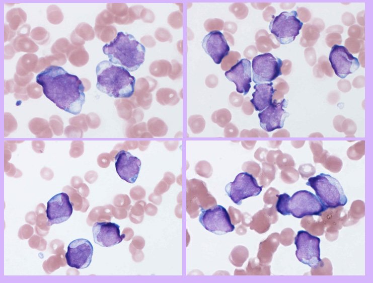 May-Giemsaでは幼若細胞の増殖があり正常造血は抑制されている。M1, M2にしては核の形が不揃いな印象がある。切れ込みのある核も見られる。