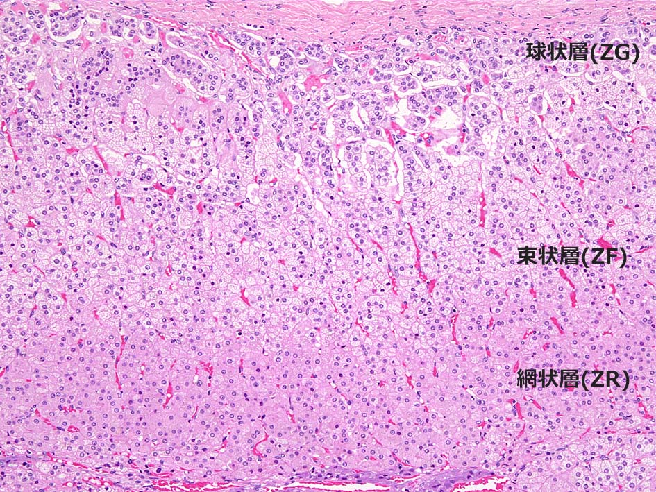 皮質には境界の不明瞭な3層構造が認められる. 被膜直下より, 球状層(Zona Glomerulosa), 束状層(Zona Fasciculata), 網状層(Zona Reticularis)と呼ばれ各々性状, 形態の異なる細胞より構成されている.