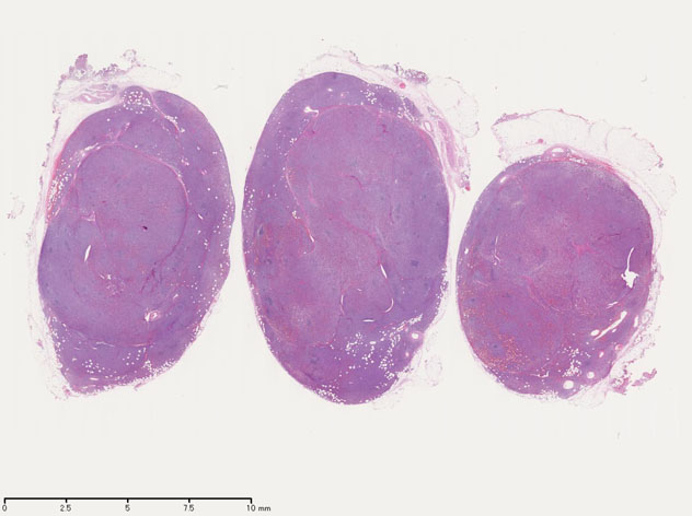 罹患リンパ節の基本構造は消失し腫瘍細胞のびまん性増殖で置換されている。非腫瘍性の小リンパ球(CD3+, CD4/8+)が濾胞様に散在して残る(Fig.01)。不整型または類円形の明るい核をもつmedium-sizeのリンパ球様細胞が密に増殖している。細胞質は乏しい(Fig.02)。CD68陽性macrophageが多く混在する部分が認められた。