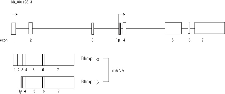 - Blimp-1βはBlimp-1αのexon3とexon4の間に存在するpromoterより転写され,Blimp-1αにあるexon1-3が欠失しており, 新たに5'末端側にexon1βをもつ。このため翻訳後のタンパク質ではPRドメインの大部分が欠失している。