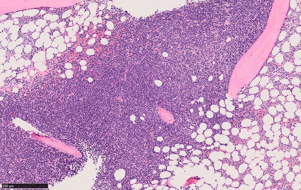 *1 Cohen PL, Kurtin PJ, Donovan KA, Hanson CA: Bone marrow and peripheral blood involvement in mantle cell lymphoma. Br J Haematol 1998; 101: pp. 302-310. *2 Pittaluga S, Verhoef G, Criel A, et. al.: Prognostic significance of bone marrow trephine and peripheral blood smears in 55 patients with mantle cell lymphoma. Leuk Lymphoma 1996; 21: pp. 115-125. *3 Weisenburger DD, Vose JM, Greiner TC, et. al.: Mantle cell lymphoma. A clinicopathologic study of 68 cases from the Nebraska Lymphoma Study Group. Am J Hematol 2000; 64: pp. 190-196. *4 Samaha H, Dumontet C, Ketterer N, et. al.: Mantle cell lymphoma: a retrospective study of 121 cases. Leukemia 1998; 12: pp. 1281-1287. *5 Bertini M, Rus C, Freilone R, et. al.: Mantle cell lymphoma: a retrospective study on 27 patients. Clinical features and natural history. Haematologica 1998; 83: pp. 312-316. *6 Wasman J, Rosenthal NS, Farhi DC: Mantle cell lymphoma. Morphologic findings in bone marrow involvement. Am J Clin Pathol 1996; 106: pp. 196-200. *7 Schenka AA, Gascoyne RD, Duchayne E, Delsol G, Brousset P: Prominent intrasinusoidal infiltration of the bone marrow by mantle cell lymphoma. Hum Pathol 2003; 34: pp. 789-791. *8 Viswanatha DS, Foucar K, Berry BR, Gascoyne RD, Evans HL, Leith CP: Blastic mantle cell leukemia: an unusual presentation of blastic mantle cell lymphoma. Mod Pathol 2000; 13: pp. 825-833. *9 Wong KF, Chan JK, So JC, Yu PH: Mantle cell lymphoma in leukemic phase: characterization of its broad cytologic spectrum with emphasis on the importance of distinction from other chronic lymphoproliferative disorders. Cancer 1999; 86: pp. 850-857.