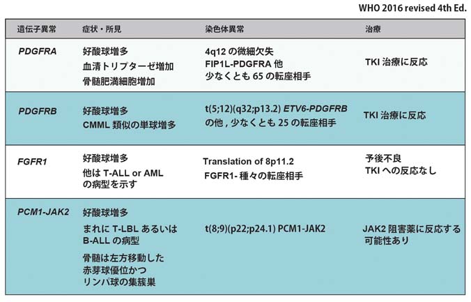 2008年WHO第4版において, 好酸球増多症のうち特定の遺伝子異常が原因と考えられる一群を「myeloid and lymphoid neoplasms with eosinophilia and abnormalities ofPDGFRA, PDGFRB or FGFR1」として骨髄系腫瘍に分類した.