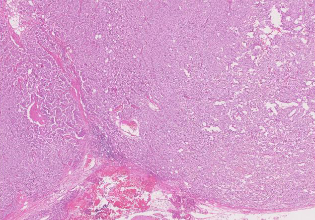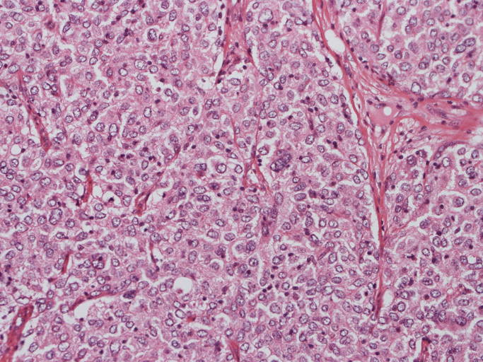 腫瘍は, 細血管を含む細い線維組織束で分画された胞巣状充実性病変で(Fig01),類円形ないし卵円形のvesicularな核をもつ円形, 多稜形の細胞が増殖している。核小体は小型, やや不明瞭。細胞質は境界が不鮮明で好酸性泡沫状を呈するものが多い。大型核やbizzarreな核の出現も認められる(Fig02-05)。血管周囲にリンパ球浸潤が認められる部分がある(Fig06,07)。