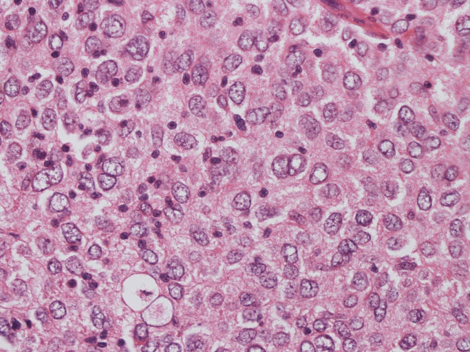 - 個々の腫瘍細胞は卵円形核を有し, 核膜は薄く, クロマチンは核縁により核小体は不鮮明あるいは相対的に小型である。多核(分葉核)や核内偽封入体を認めることもある。核分裂の頻度は低い。
