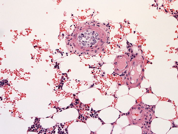 (骨髄穿刺吸引では発見できなかった原因のようです。骨髄生検で細動脈がとれないと診断に結びつかなかったでしょう。)