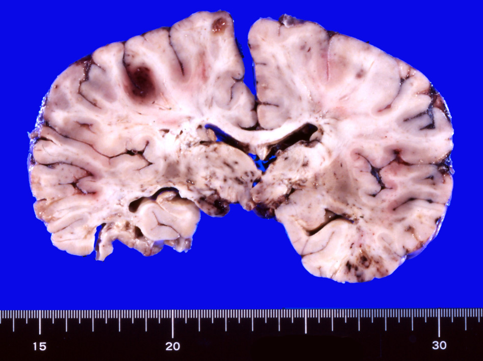 抗凝固療法をおこなう。その後MRIでは穿通枝梗塞増加. ビンスワンガー症状は動揺しながら若干悪化。ステロイド投与開始, 発語量増加, 独歩可能となる. しかし夜間せん妄出現. parkinsonism,痴呆症状が悪化した。骨髄穿刺:低形成髄。hemophagocytosisあり。異型細胞の増殖は認められなかった。追加MRI: 右放線冠などに急性梗塞が多発。抗凝固療法, ステロイドを持続, 発症より6ヶ月になり意識状態低下。CT, MRIで梗塞が急速に増加した。7ヶ月め深昏睡, 瞳孔散大, 永眠される。CTでは無数の梗塞により中心ヘルニアを呈していた。臨床上, 非定型的脳梗塞で最終的には血管内悪性リンパ腫症を疑い病理解剖をおこなった。