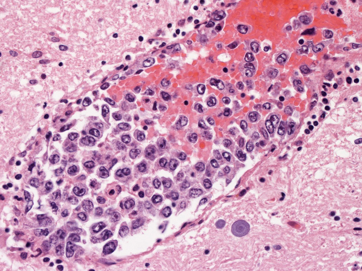 脳;くも膜下腔の小動脈内, 脳白質の細血管内に腫瘍細胞が充満している。