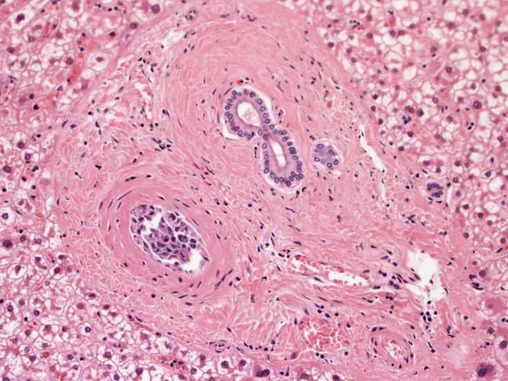 肝臓;グリソン鞘内、細肝動脈に腫瘍細胞あり。肝細胞は虚血のため変性しているようです。