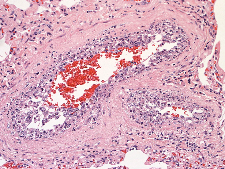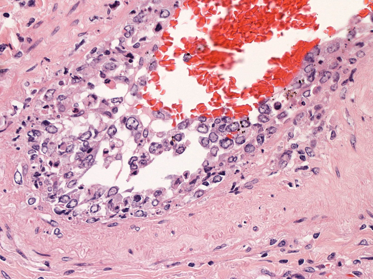 肺B;小気管支動脈, 肺動脈内を腫瘍細胞が閉塞する. 動脈内膜に浸潤性増殖している(B)。