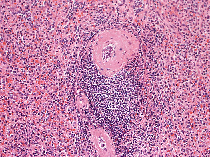 脾臓;白脾髄リンパ組織には腫瘍細胞は認めず、筆動脈内に増殖。