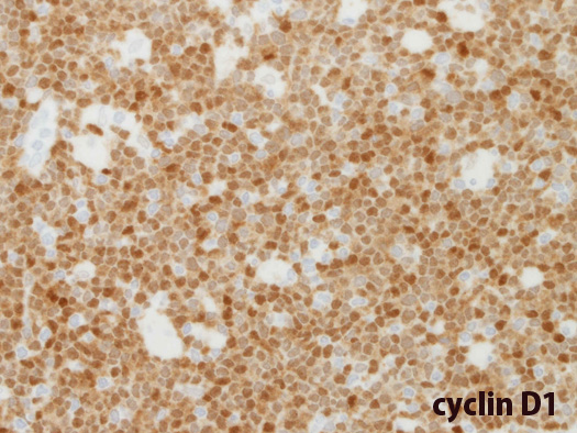 免疫染色:増殖リンパ球はCD20, CD5陽性。核にcyclin D1陽性