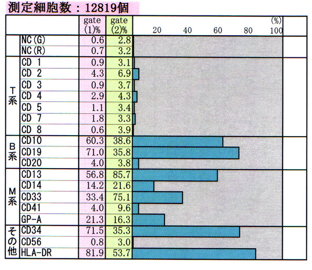 以上, (pro)Bリンパ球系芽球と骨髄球系芽球の2系統の芽球が存在し, MPALと考えられる。esterase染色は陰性であった。