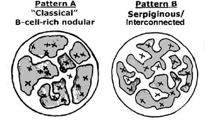 結節は, しばしば小リンパ球増多がほとんどで, 組織球はほんのわずかなことがある. びまん性領域では, 組織球が多く, 小リンパ球に乏しい.