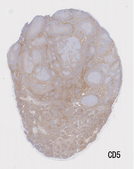 不整形の胚中心(CD20+, CD10+, BCL2-)のまわりにはCD5陽性リンパ球が多く存在してマントル層を形成している. (IgD染色でもマントル層はよく認識できる). 胚中心内のCD5+ cellはfollicular helper T-cellのようです.